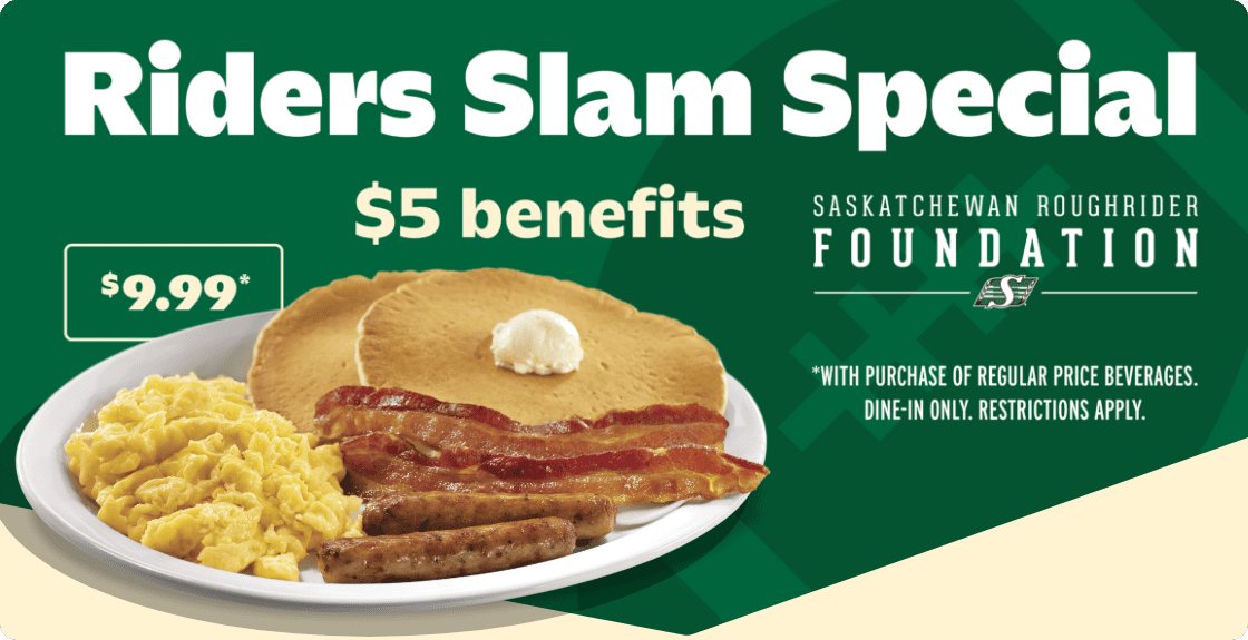 Join us the day before the next 2025 Roughriders Home Game at any of our 4 Saskatchewan locations for a special $9.99 Original Grand Slam!
