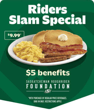 Join us the day before the next 2025 Roughriders Home Game at any of our 4 Saskatchewan locations for a special $9.99 Original Grand Slam!