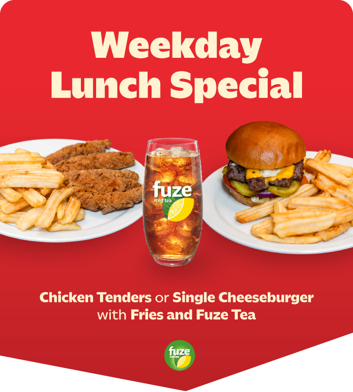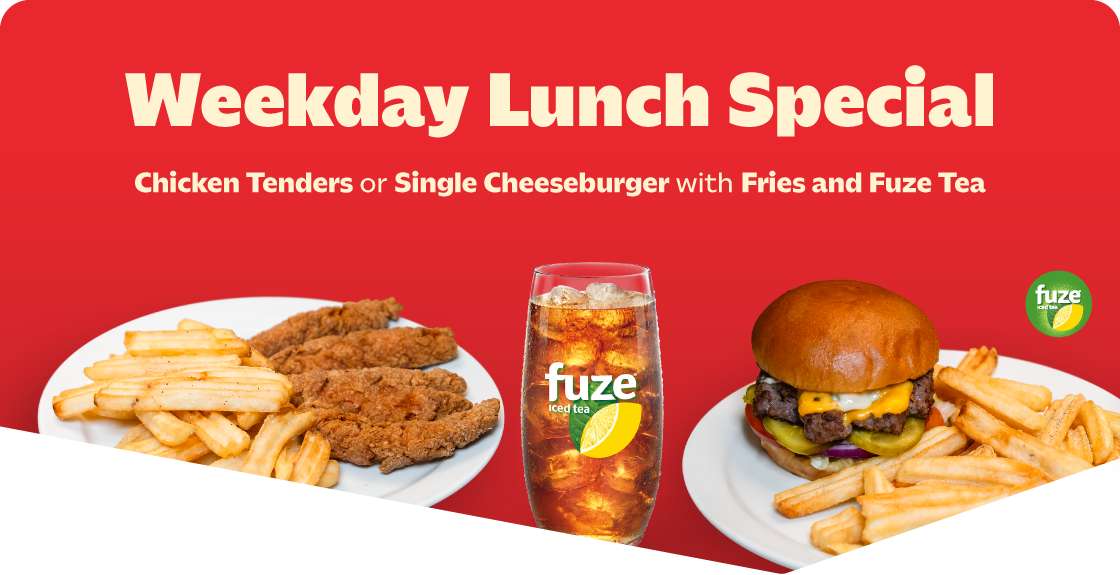 Your choice of a Single Cheeseburger or Chicken Tenders. Both menu items will be served with Fries and a Fuze Tea.